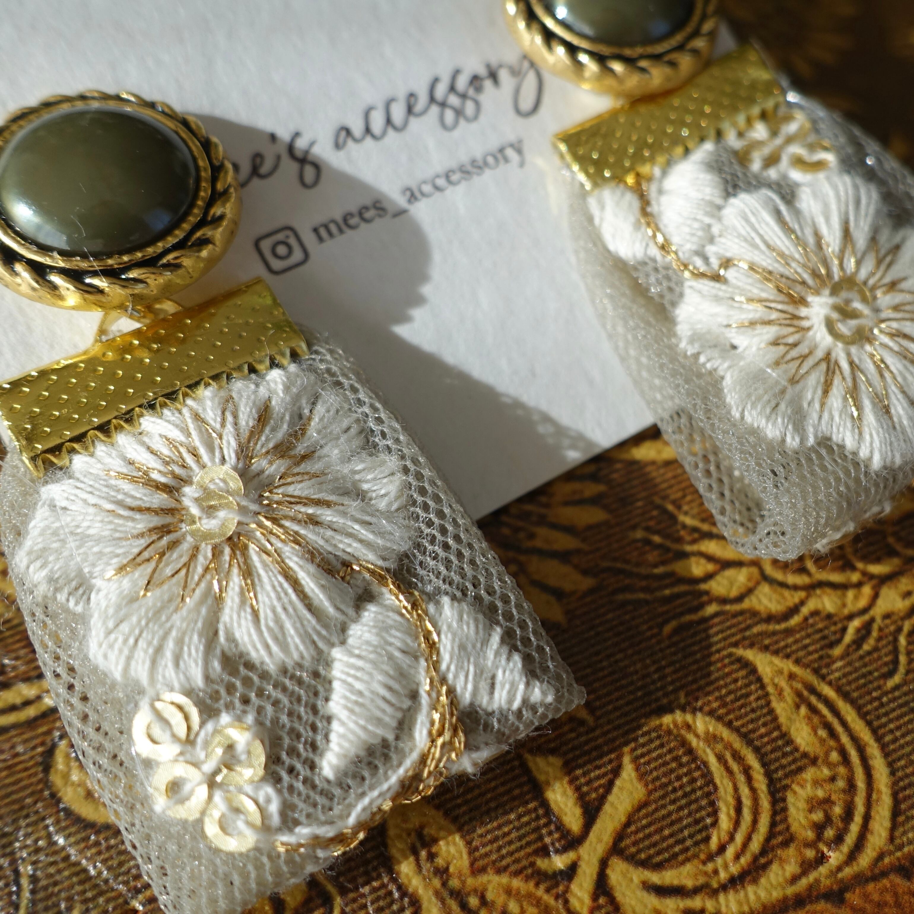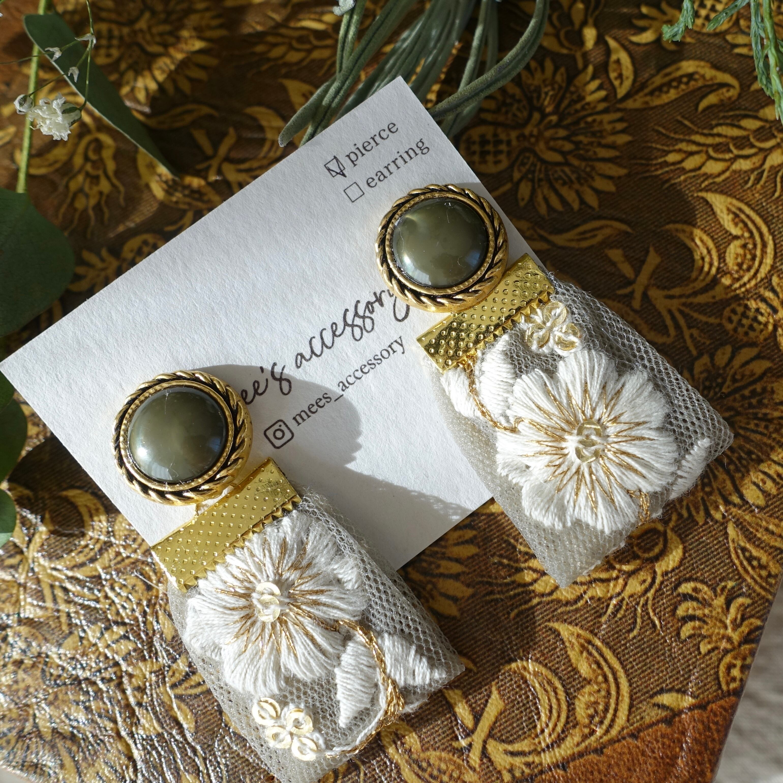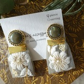 小さめでちゅるんとしたカーキのヴィンテージボタンと、大人可愛いグレー地のインド刺繍リボンを合わせました*