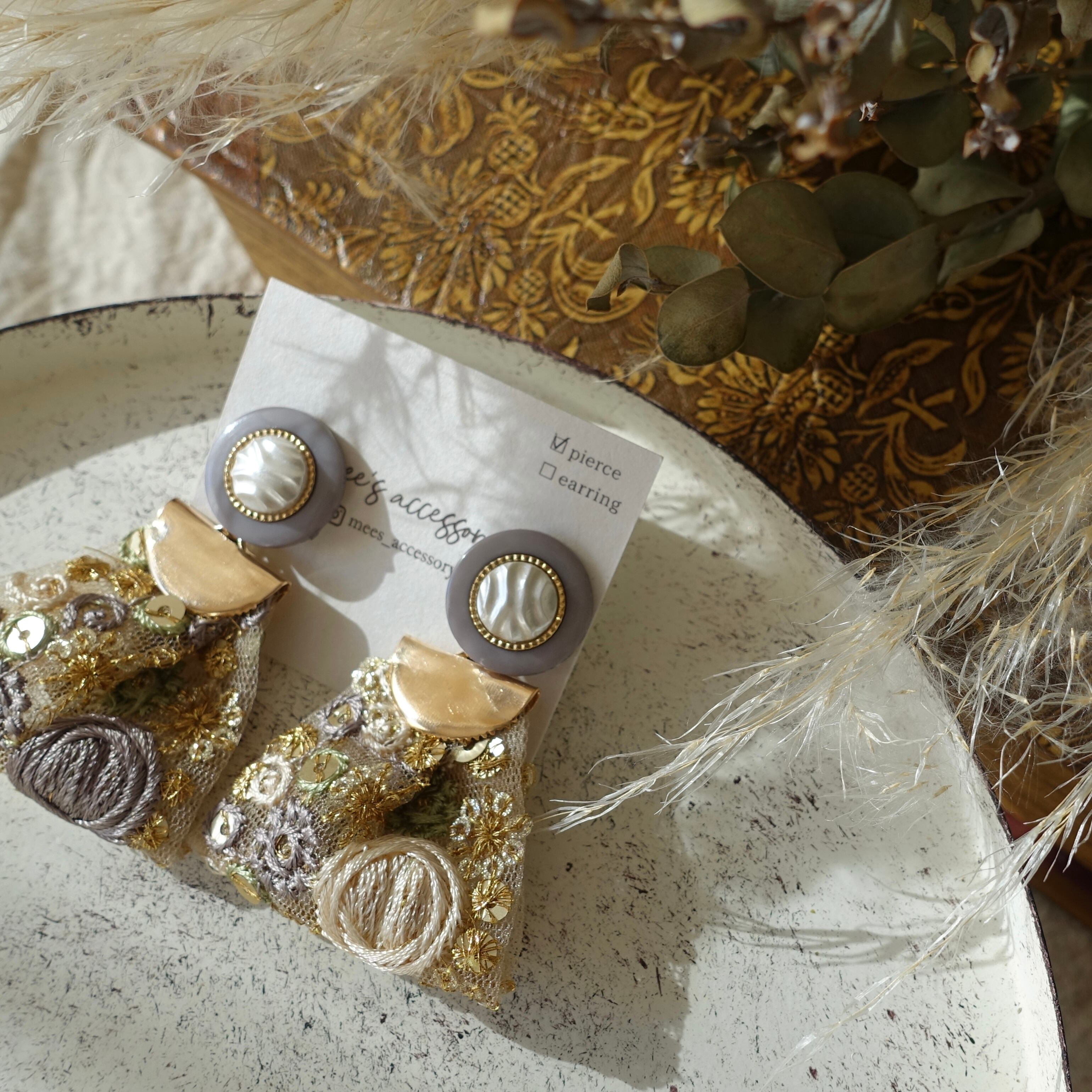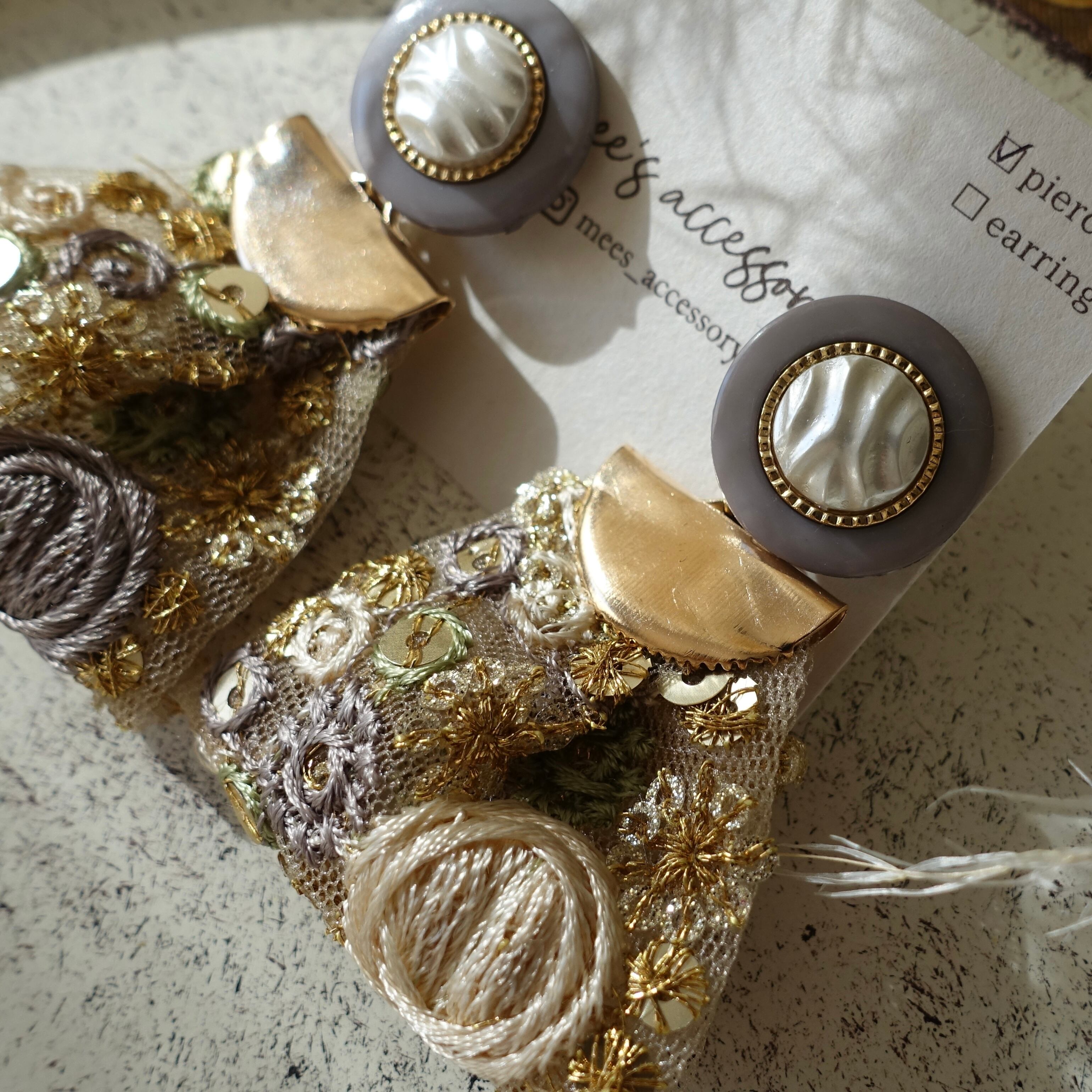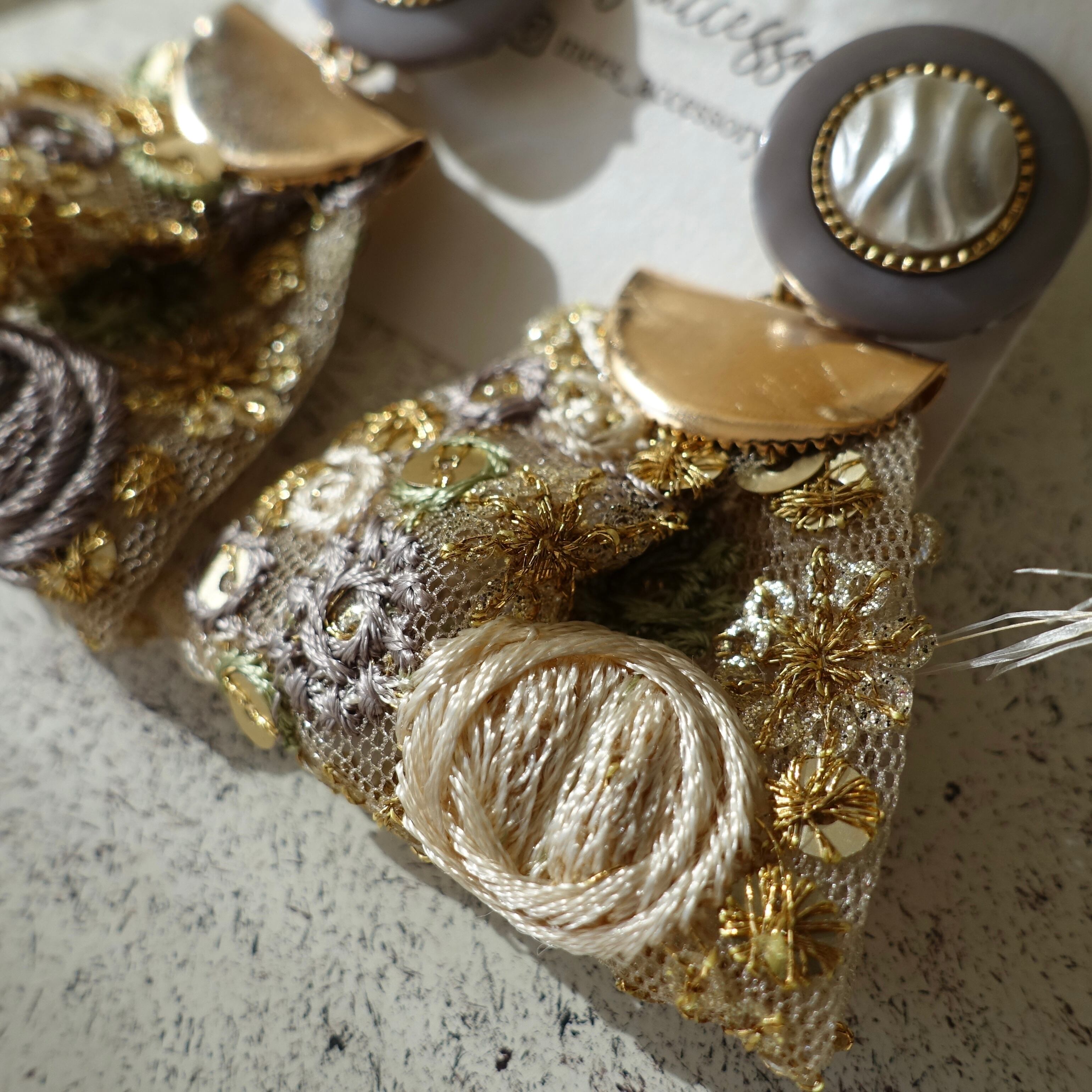インド刺繍リボンはスパンコールやくすみカラーの糸が沢山!華やかでクラシックなデザインに仕上げています。
