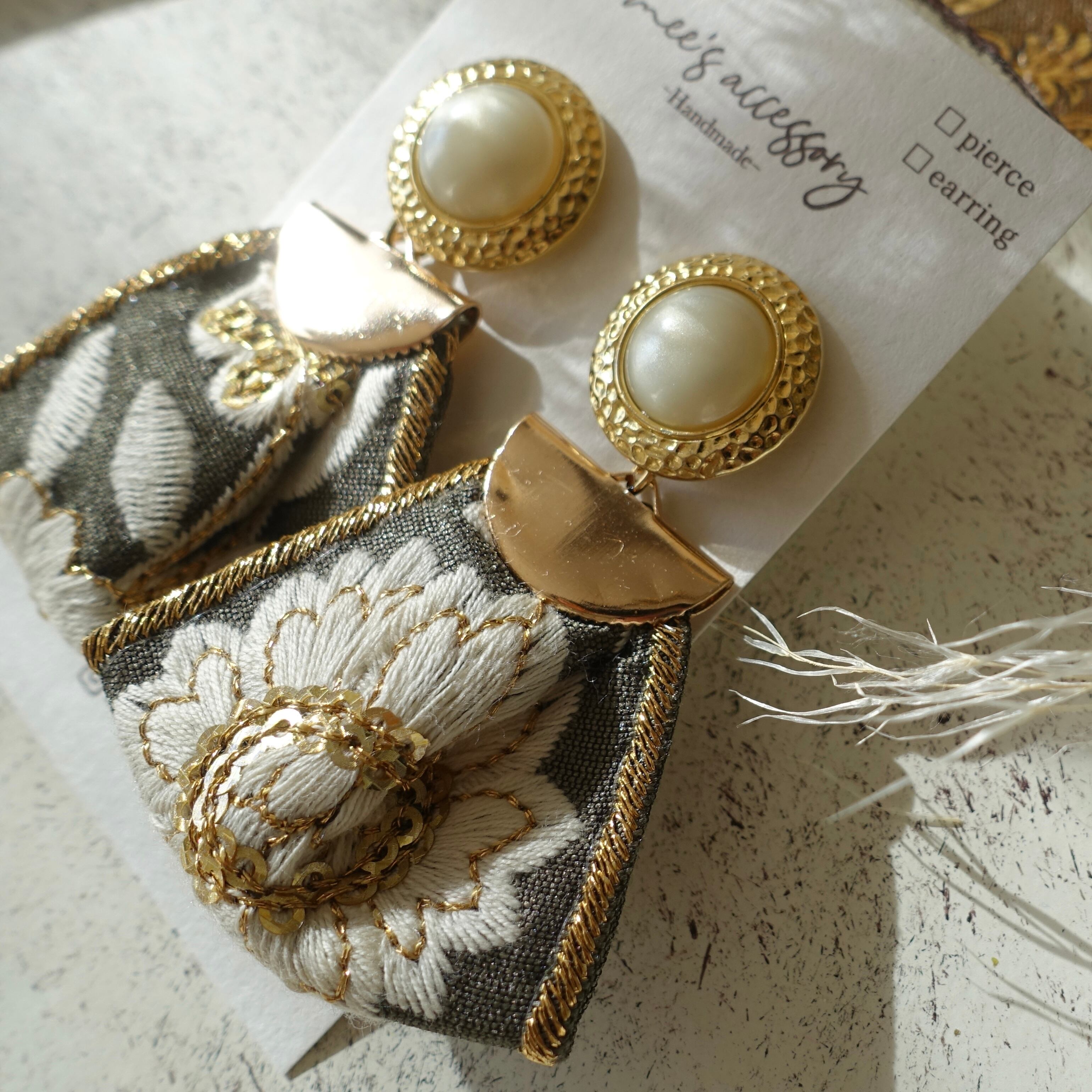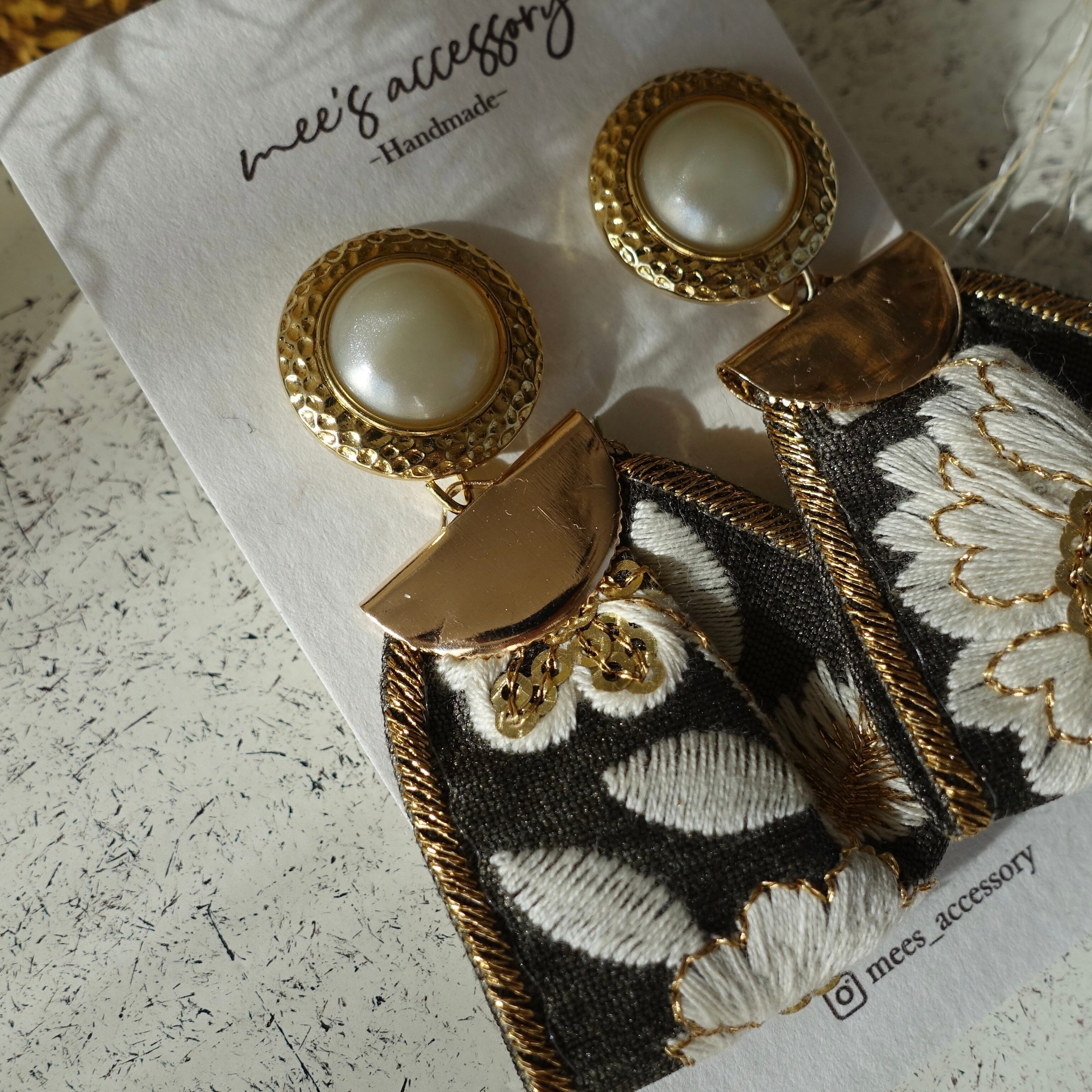 落ち着いたカーキの布刺繍リボンに合わせました*金糸やゴールドのスパンコールも散りばめられていて、落ち着いたカラーながらも目を惹くアクセサリーに仕上がっています。