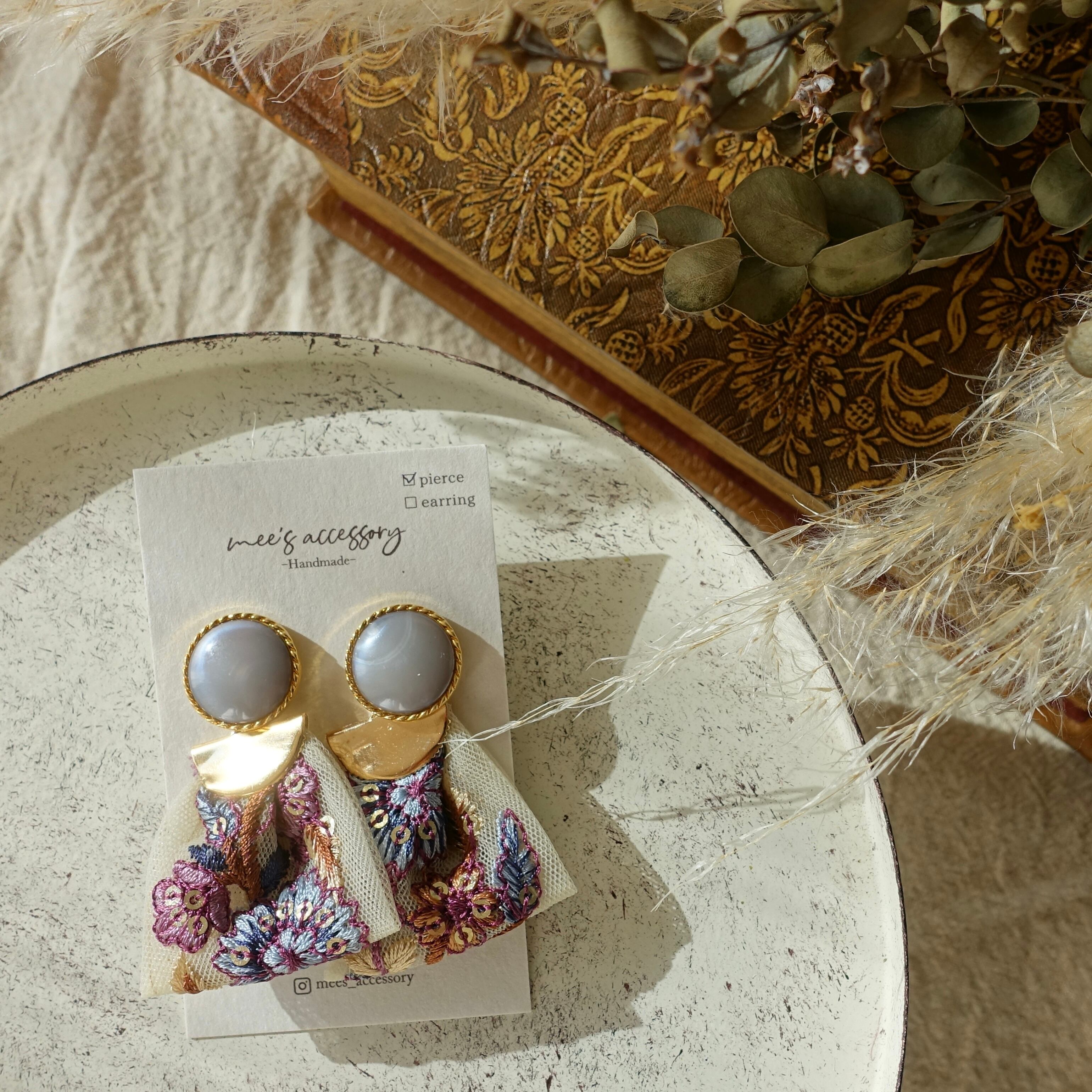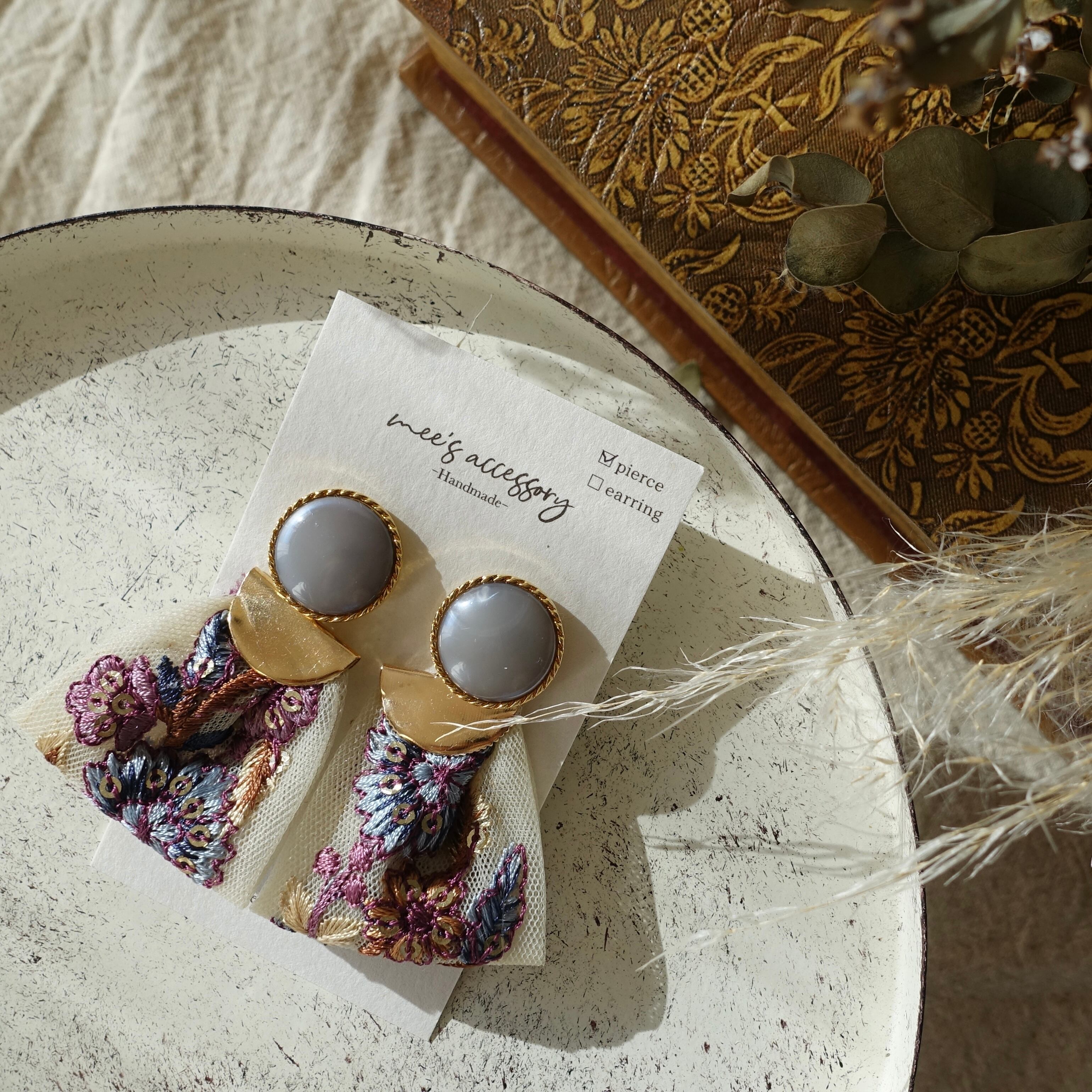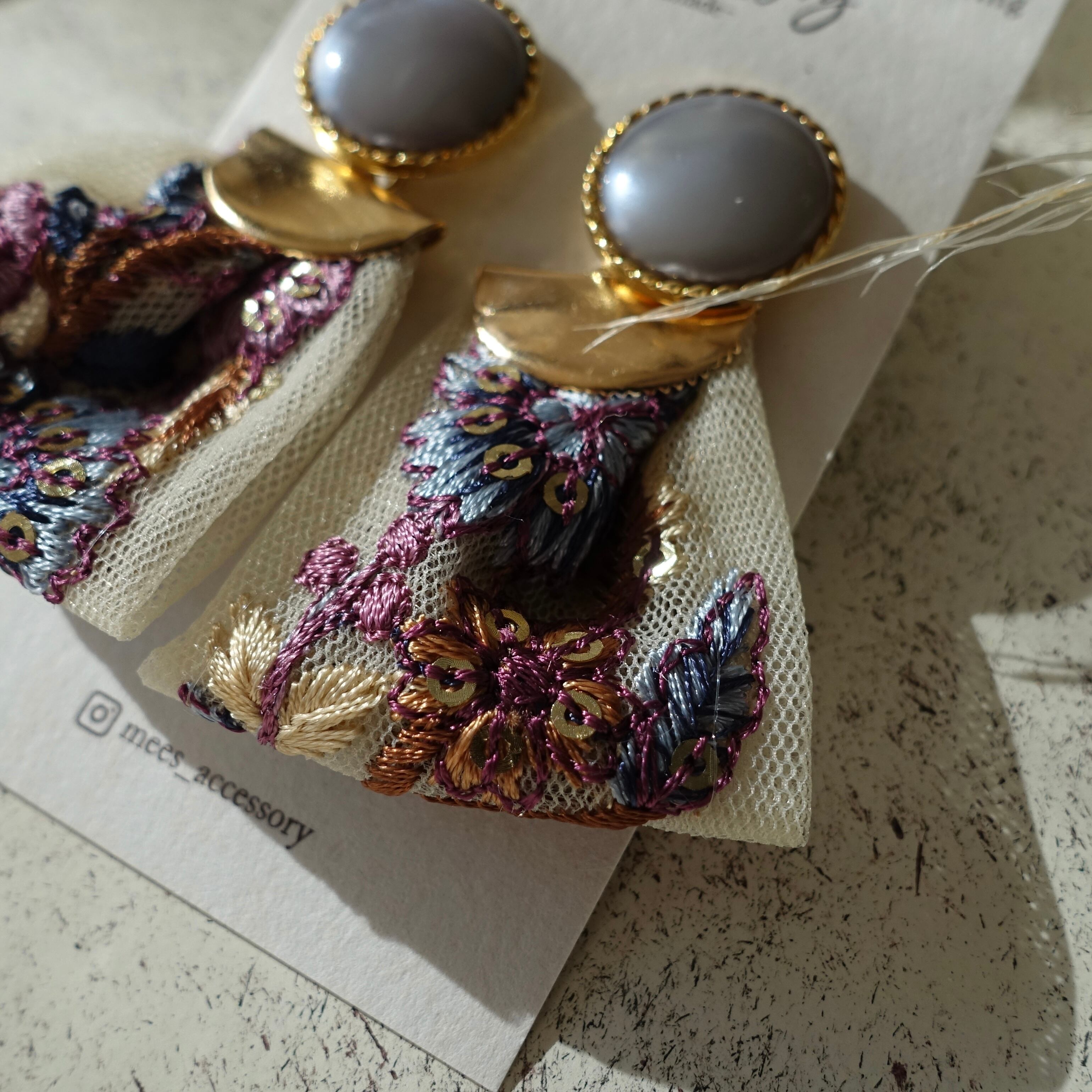 薄いブルーグレーのヴィンテージボタンカボションに、花柄が際立つ刺繍リボンを合わせました*
