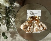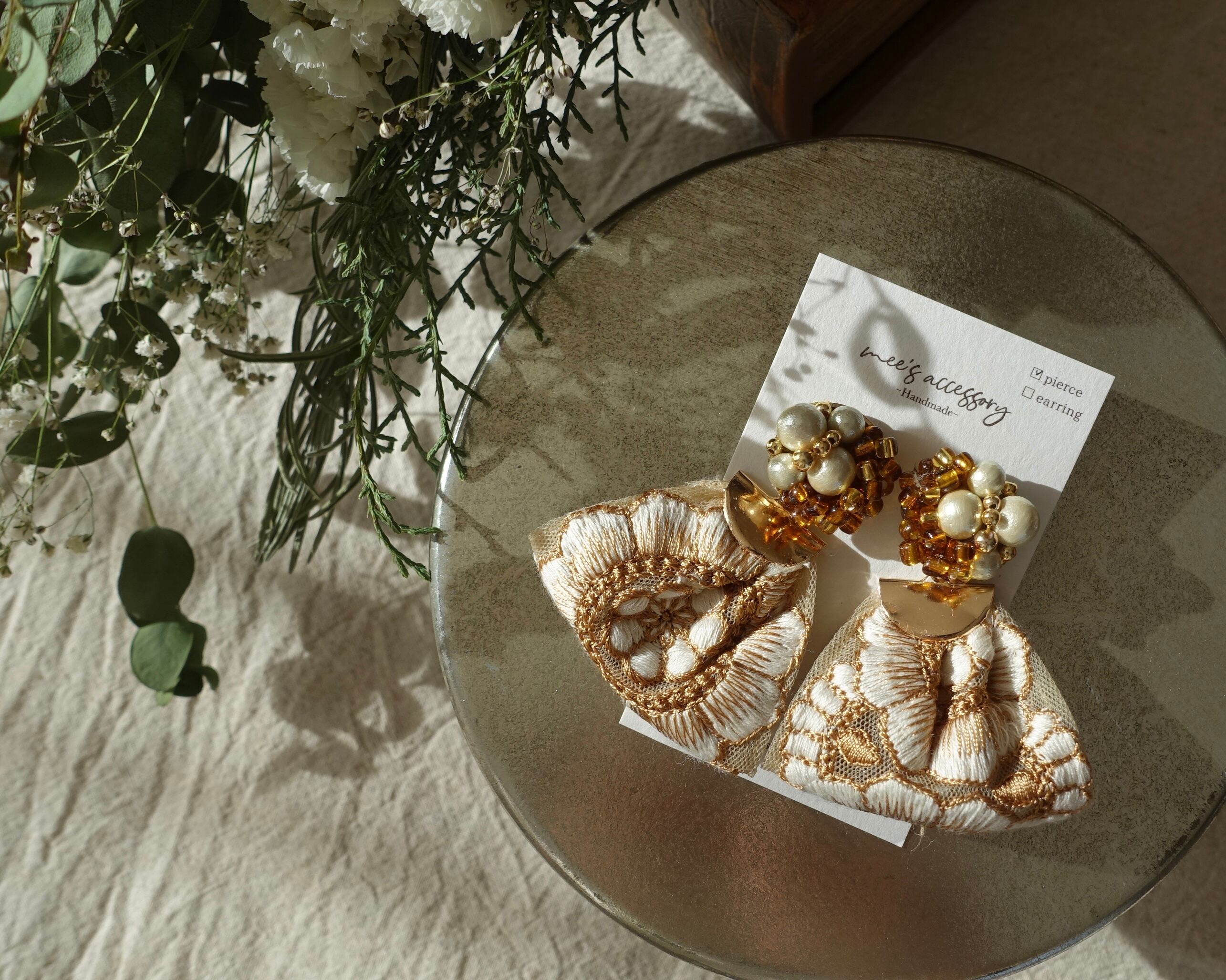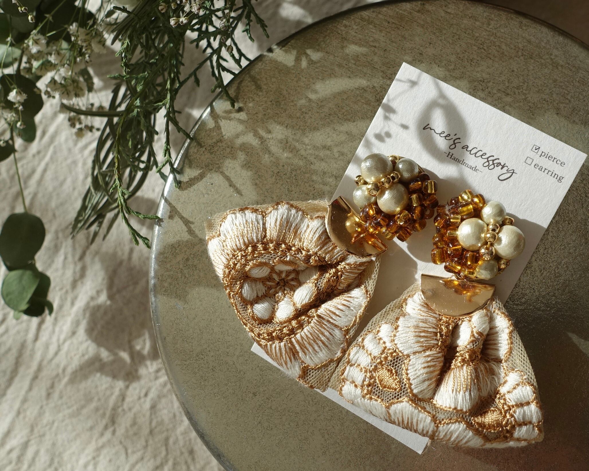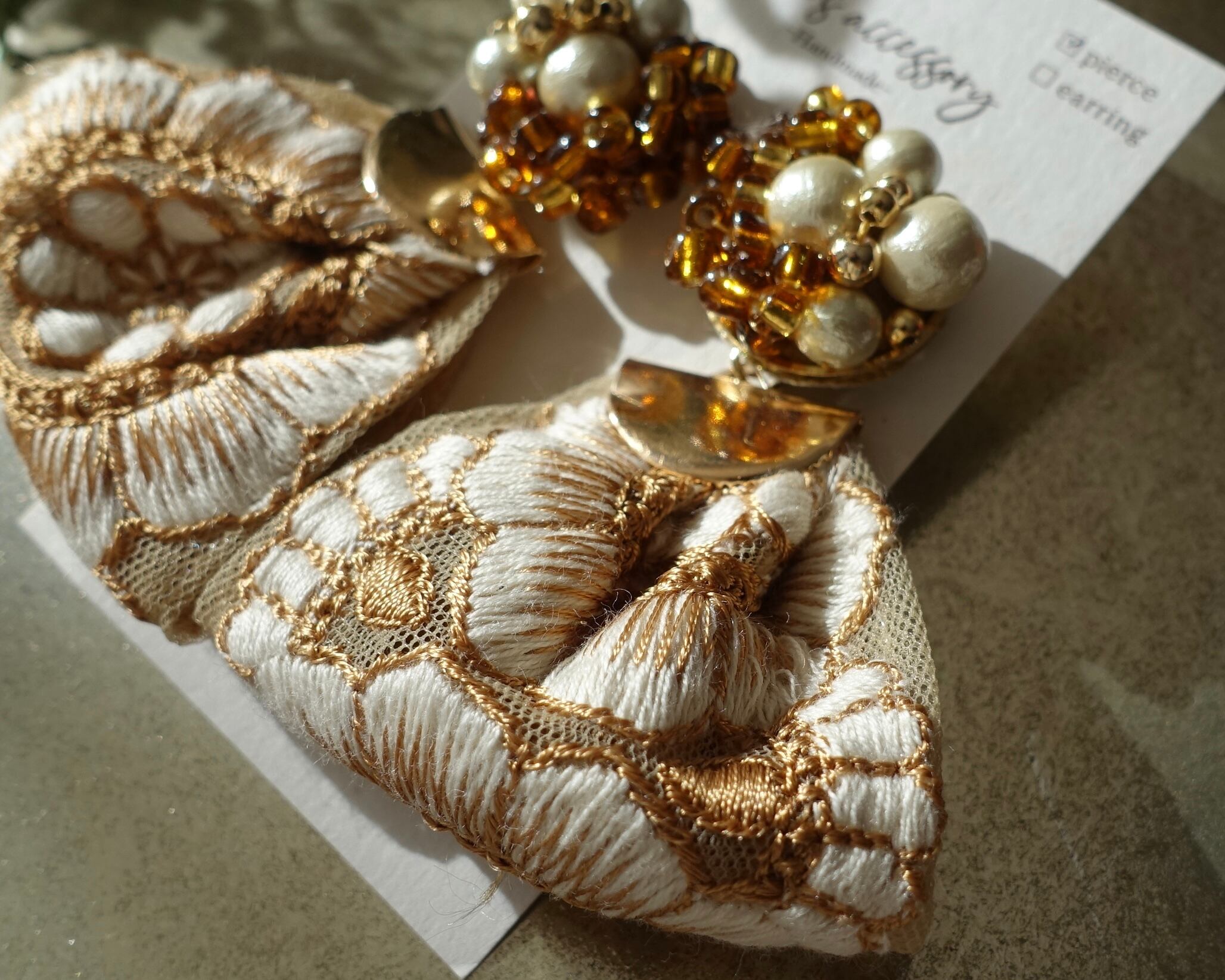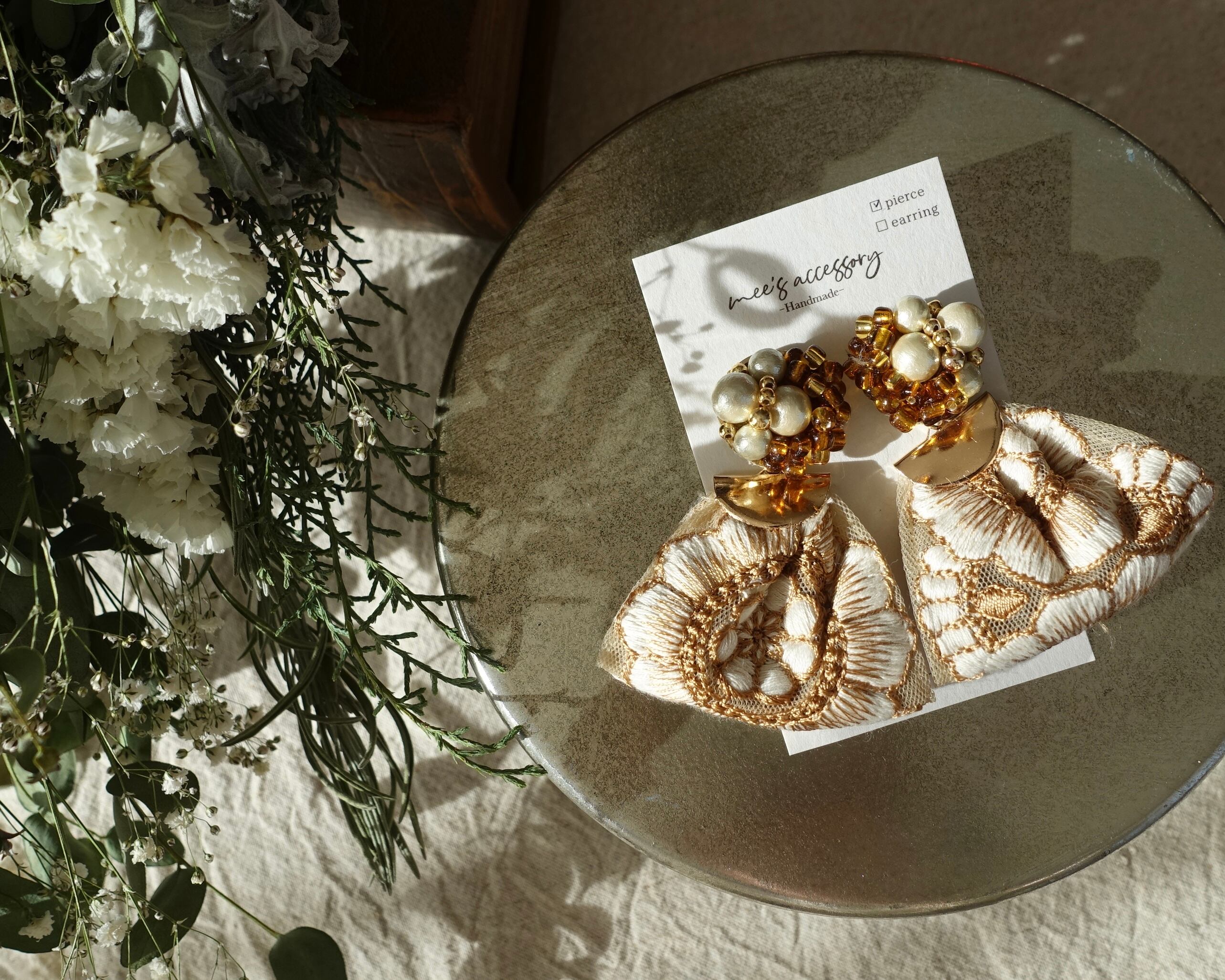 コットンパールとビーズが素敵な刺繍カボションと、ベージュベースの大振り花刺繍チュールリボンを合わせました*