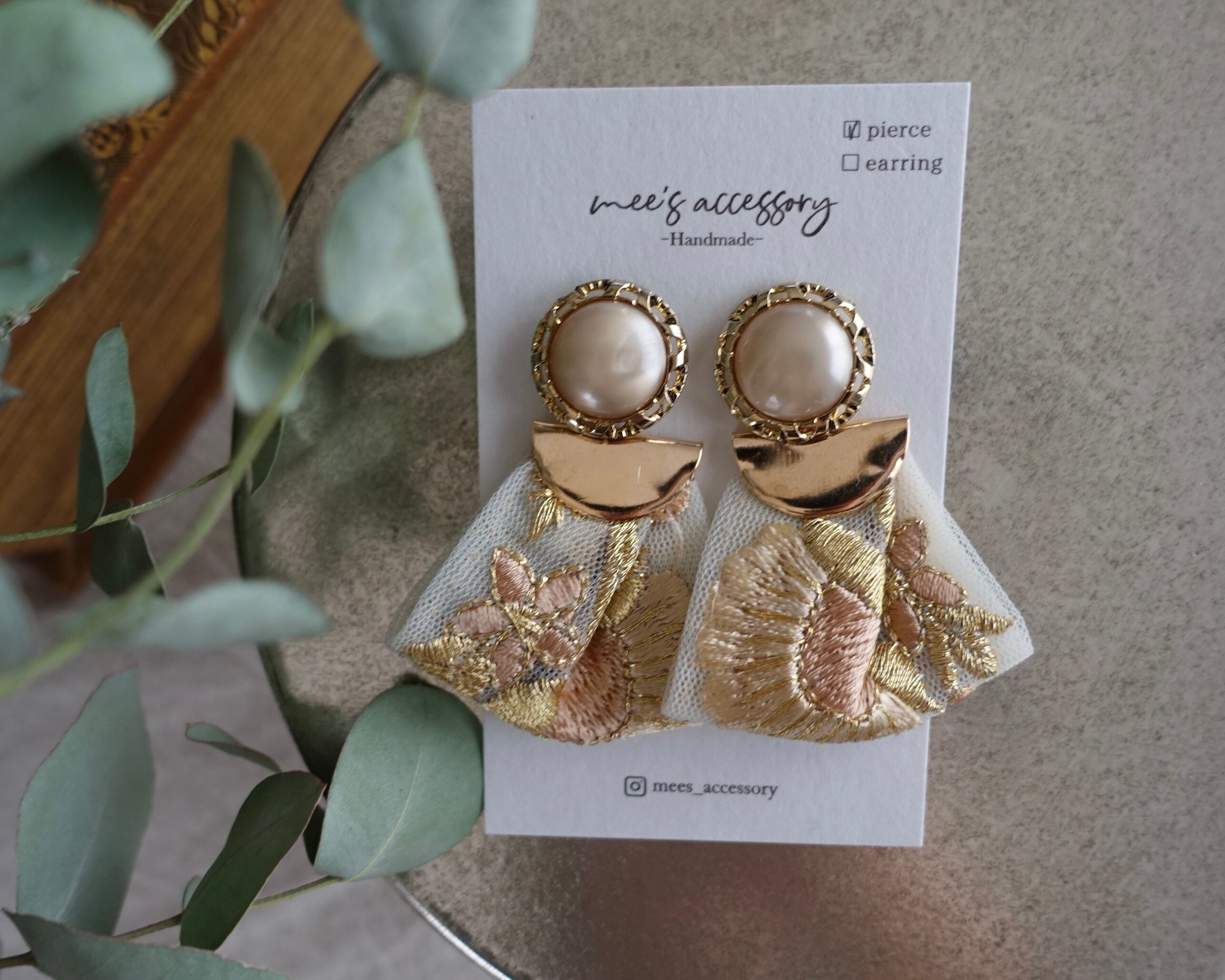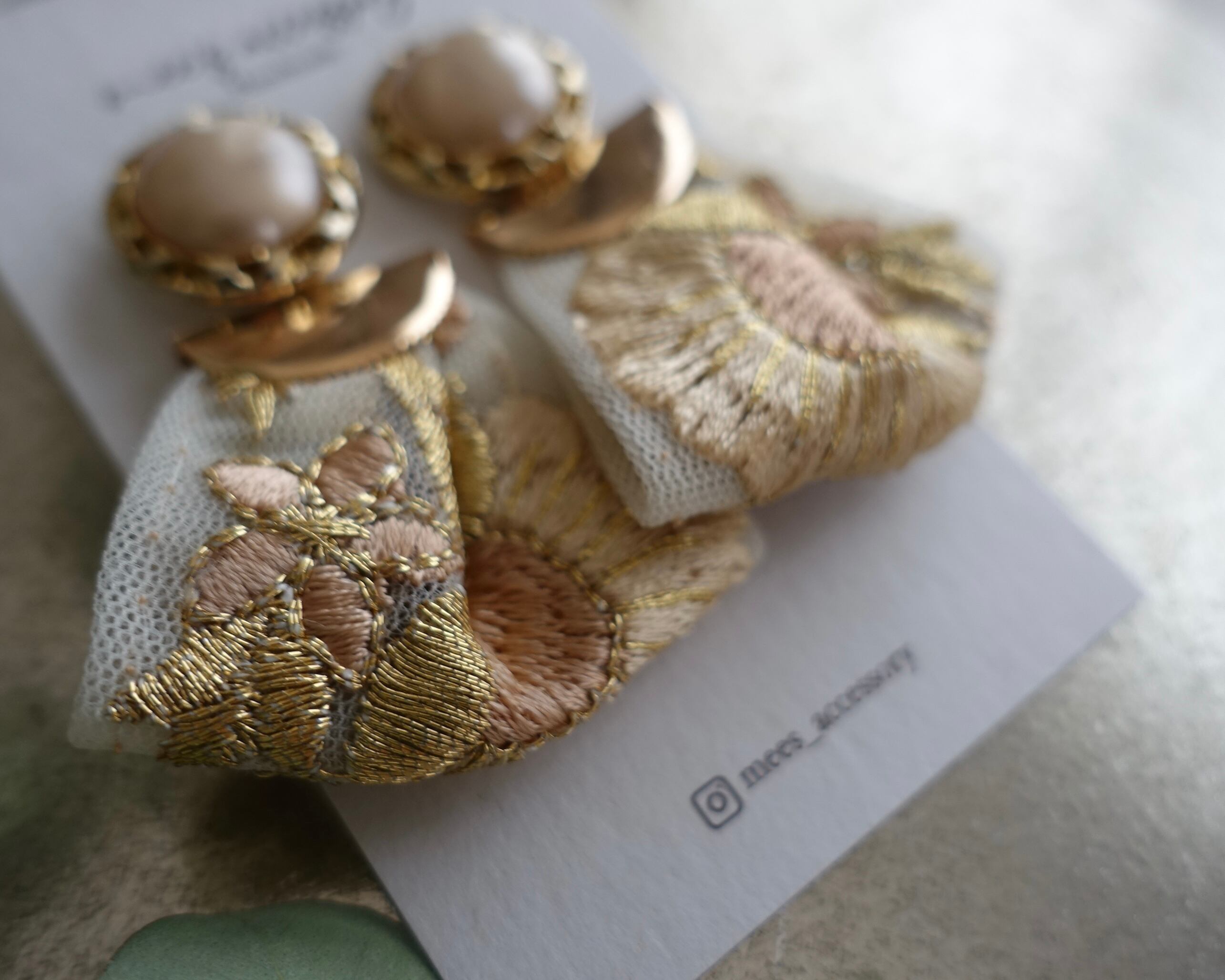 ツヤっとしたベージュの素敵なボタンと、同系色のチュール刺繍リボンを合わせました*