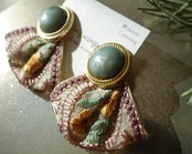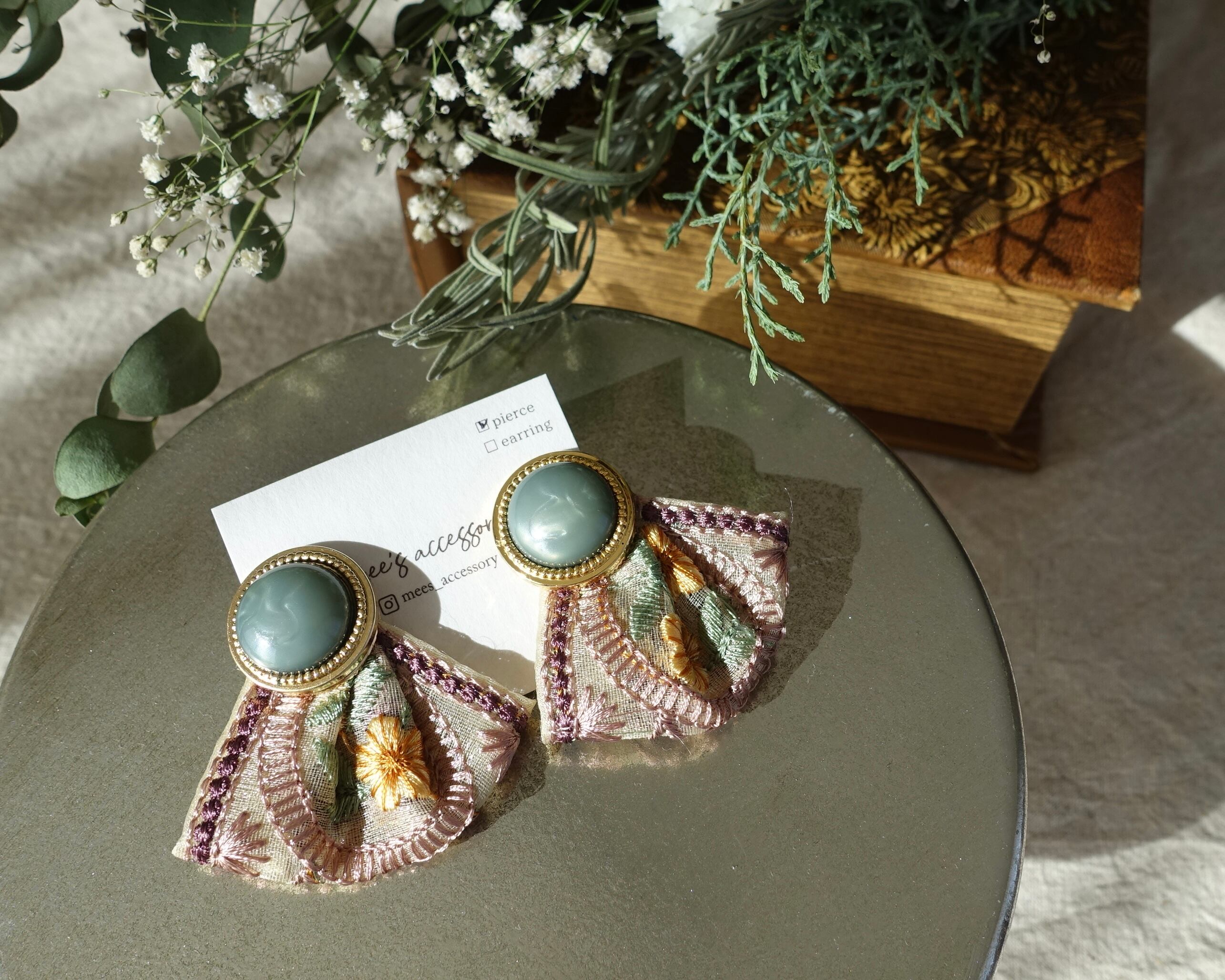 一際目を惹くグリーンの大振りボタンと、アンティークなデザインの刺繍リボンを合わせました*