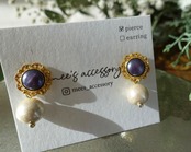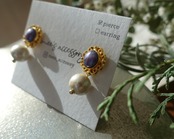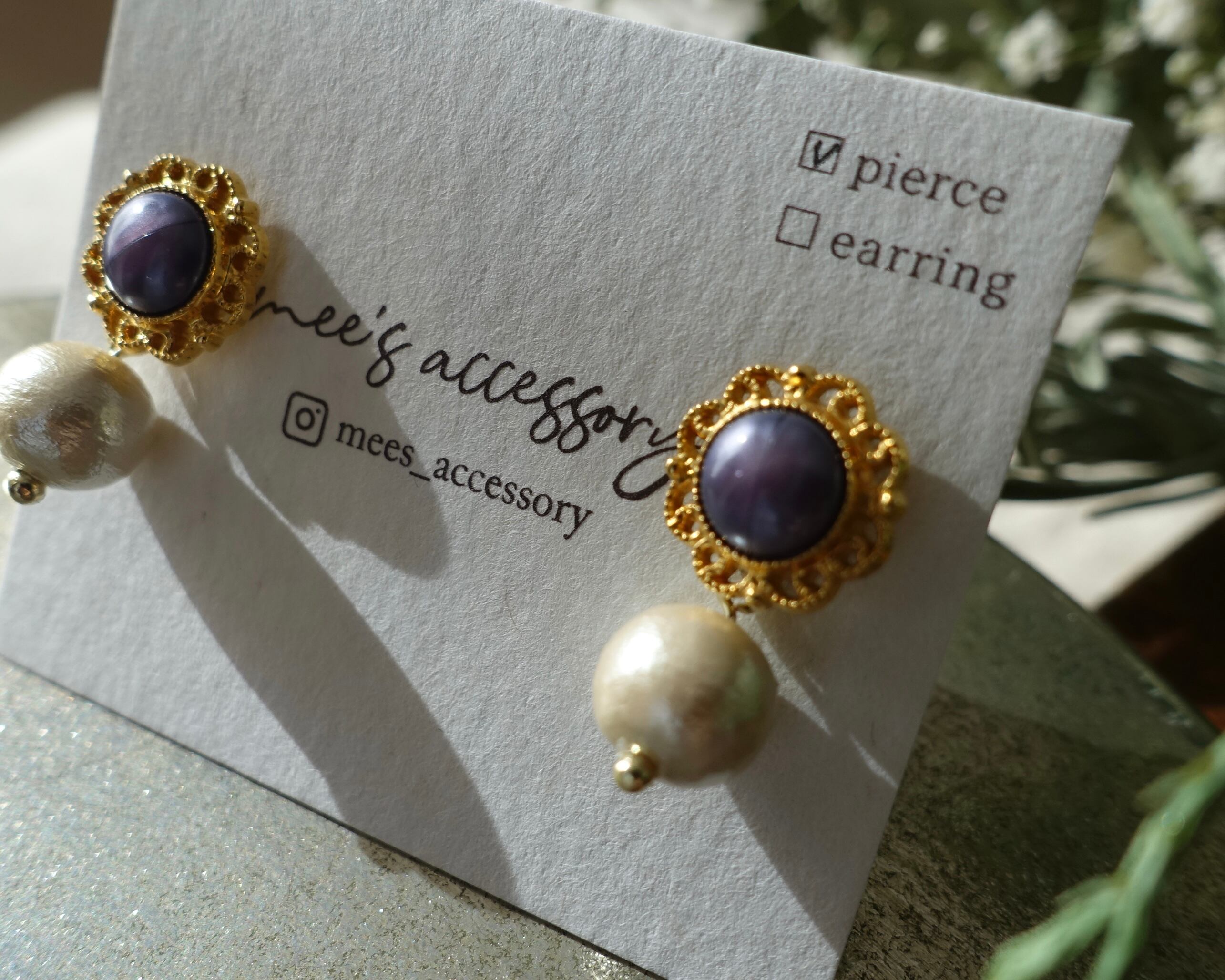 青紫の珍しい花型ボタンに、キスカコットンパールを合わせました*