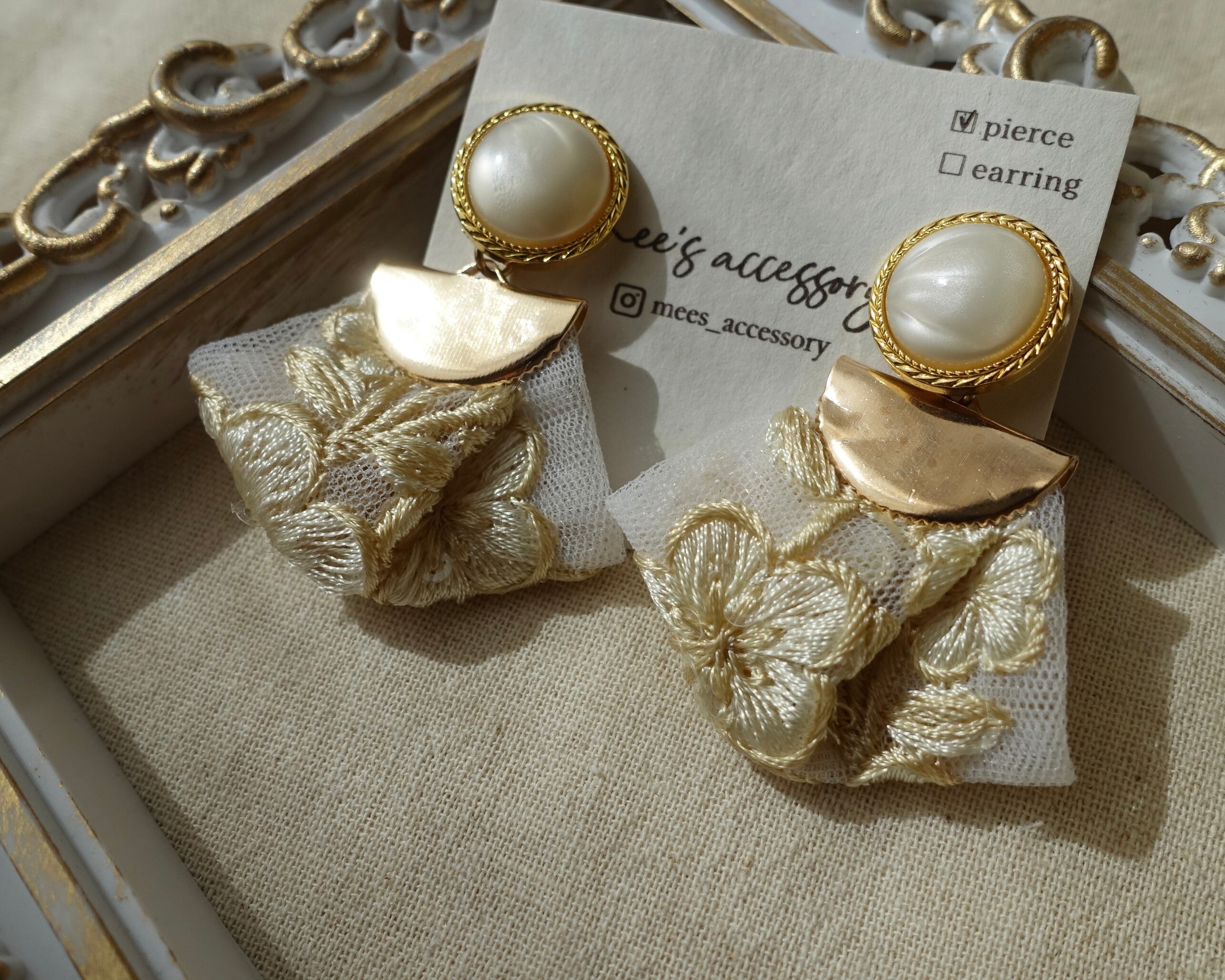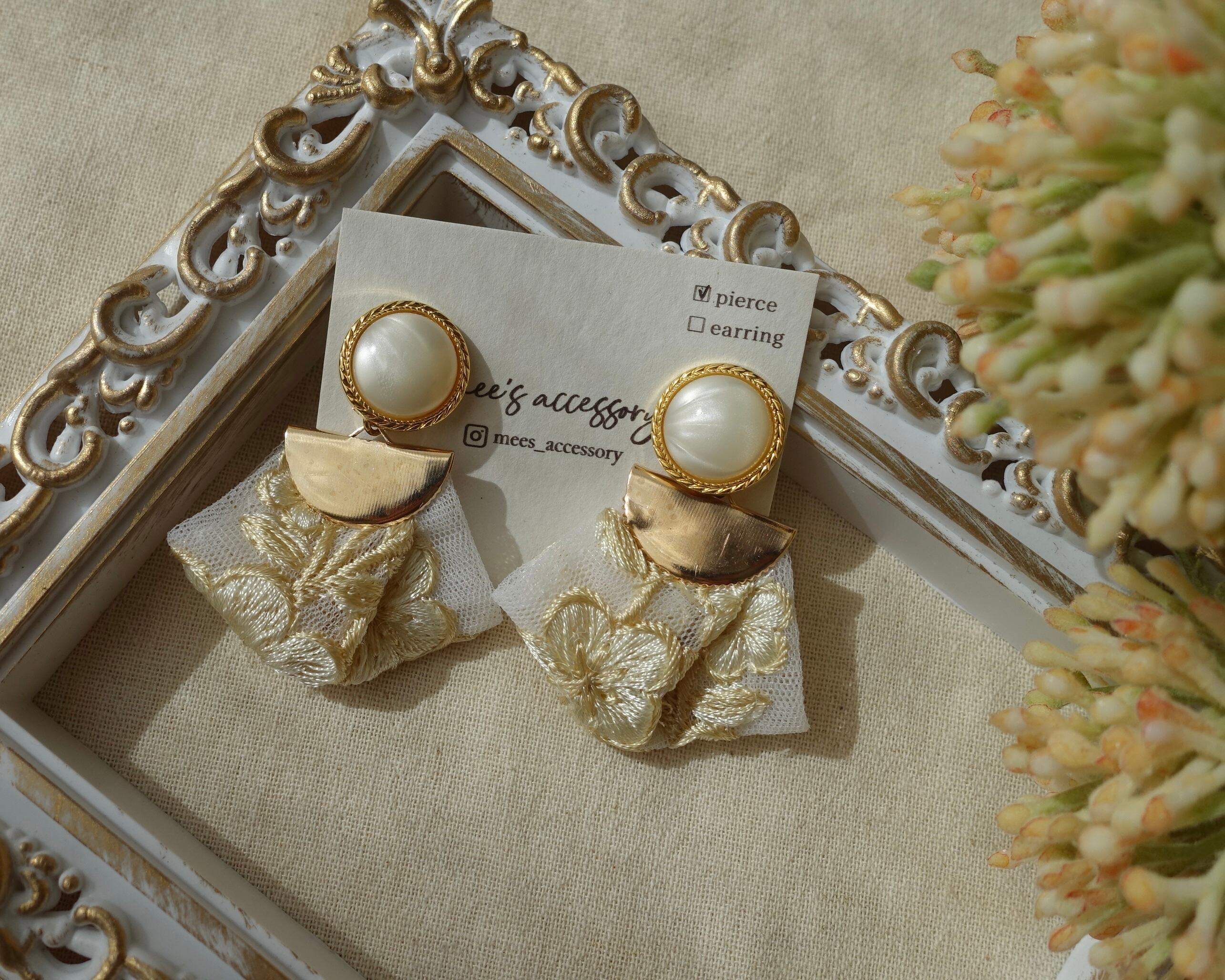 金縁が印象的なヴィンテージボタンと、パキッとしたホワイトのチュールリボンを合わせました*